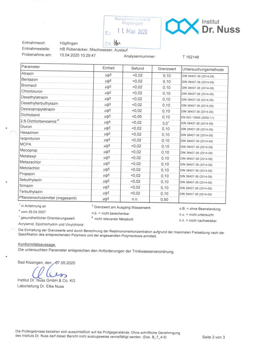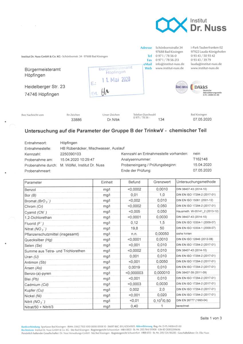 Unser Trinkwasser kann ohne Bedenken direkt aus der Leitung getrunken werden. Die Wasseranalysen, die die Gemeinde Höpfingen regelmäßig durchführen lässt, verdeutlichen die hervorragenden Werte.