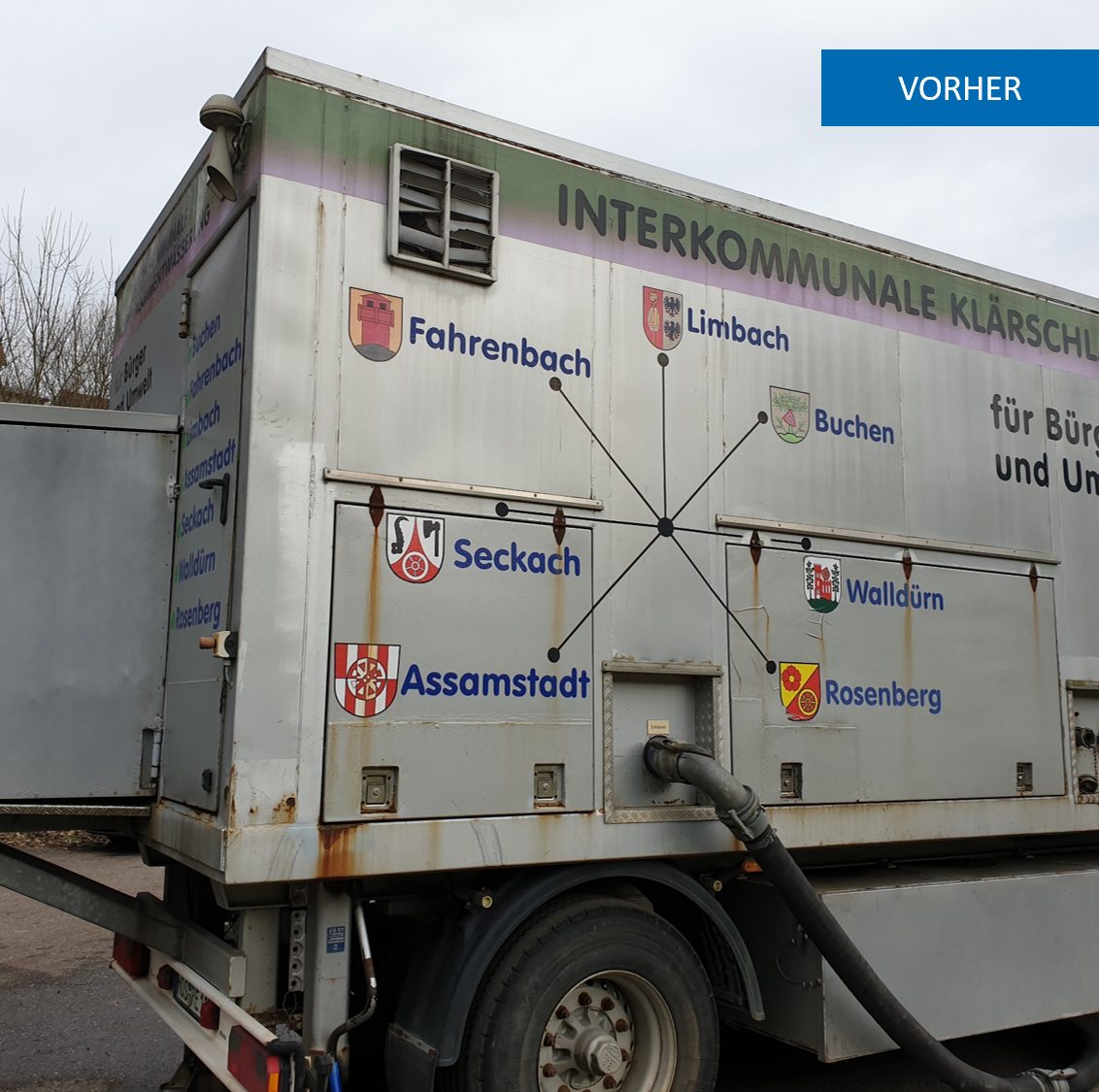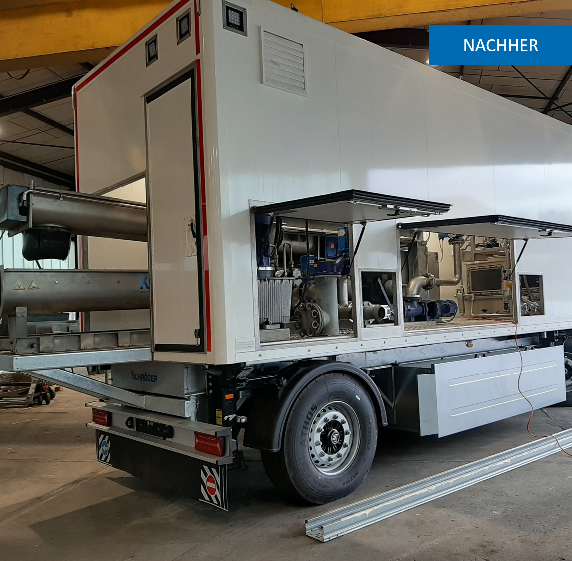 Der alte Anhänger wurde von der Firma KUHN GmbH demontiert, die Zentrifuge von einem Spezialisten in Würzburg überholt und das Fahrgestell sowie der Aufbau von einem örtlichen Fahrzeugbauer neu geliefert. Die Schaltanlagen für die Zentrifuge und die Flockungsmittelaufbereitung mit -dosierung wurden von KUHN komplett erneuert und in einem Schaltschrank zusammengefasst.