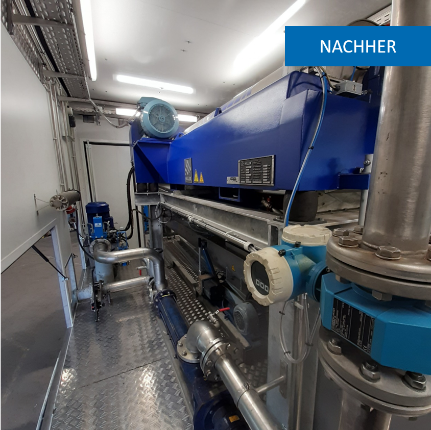 Die Inbetriebnahme wird demnächst zusammen mit dem Zentrifugenspezialisten auf einer Anlage, die durch diese externe mobile Schlammentwässerung bedient wird, erfolgen.