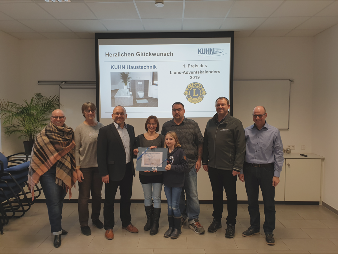 Dieser erste Preis konnte nun von den Geschäftsführern der KUHN GmbH, Dr. Michael Kuhn und Jürgen Kuhn, im Rahmen eines kleinen Empfangs, an dem auch die Vize-Präsidentin Frau Ursula Hammer und Frau Beate Tomann vom Lions Club teilnahmen, an die Gewinnerin Frau Nicole Münster aus Schweinberg und ihre Familie übergeben werden.